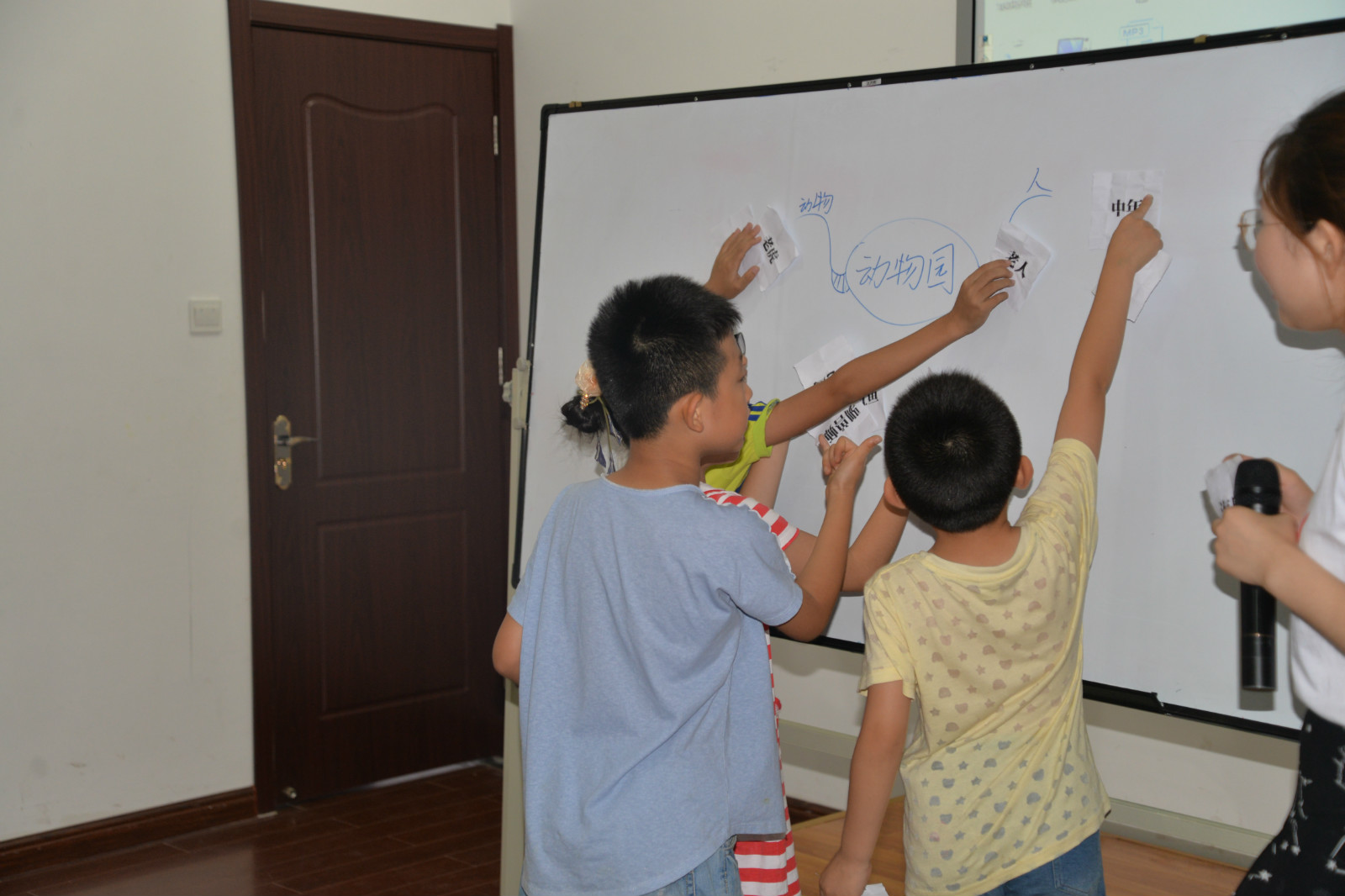 當(dāng)天的結(jié)課小典禮上,老師們還設(shè)置了“現(xiàn)場(chǎng)找找找”游戲,根據(jù)黑板上“動(dòng)物”和“人”的分類,尋找藏在教室里的小卡片進(jìn)行現(xiàn)場(chǎng)梳理分析。游戲一開(kāi)始,大人孩子齊上陣,緊張中夾雜著歡笑,享受另類的學(xué)習(xí)過(guò)程。